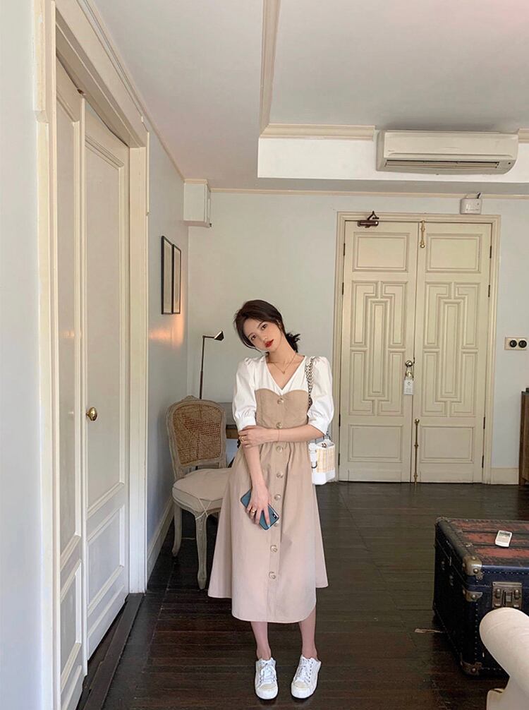 トレンチ素材とカットソーのステッチデザインが目を惹くワンピース。ふわっと広がった腕のラインも魅力の1つ❤︎